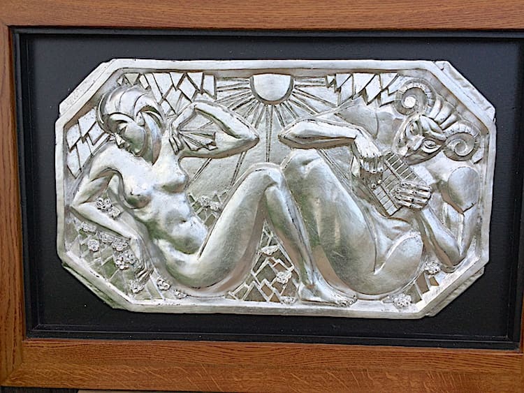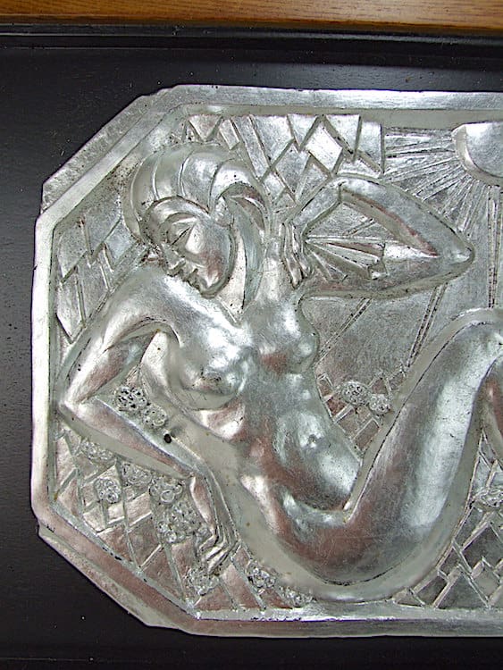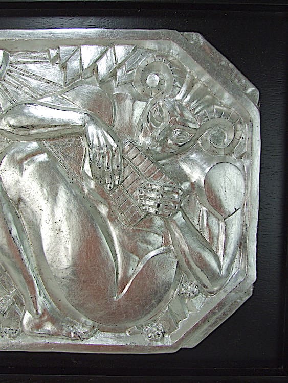 A large gesso plaque – a copy of an original design by Marcel Bouraine. The original was made for the 1926 Paris Arts Decoratifs Exhibition. Silver leaf on plaster framed in solid oak wood.