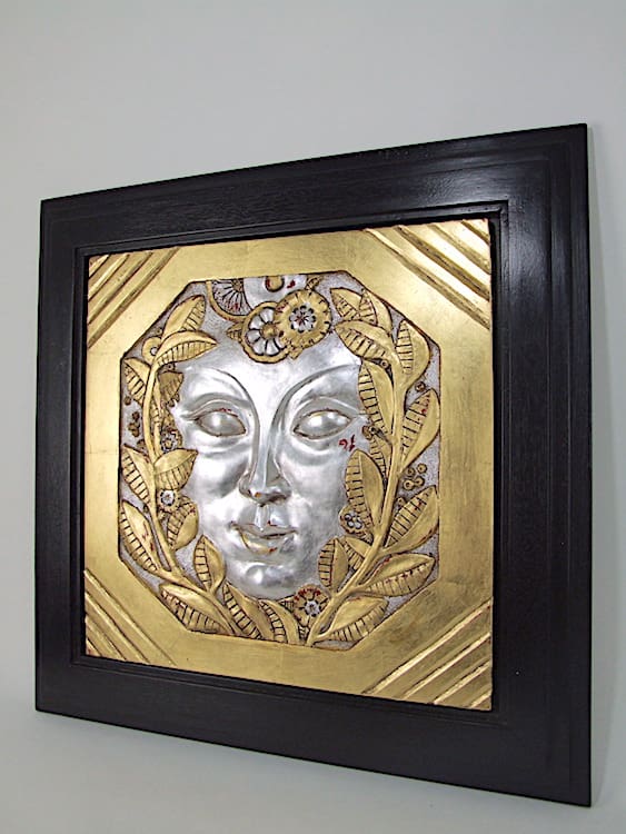 Based on the original design by Marcel Bouraine for the 1925 Paris Exposition des Arts Decoratifs – this art deco wall plaque is made of gesso and applied with silver leaf. Professionally framed and mounted in a black satin finish stepped wood frame.