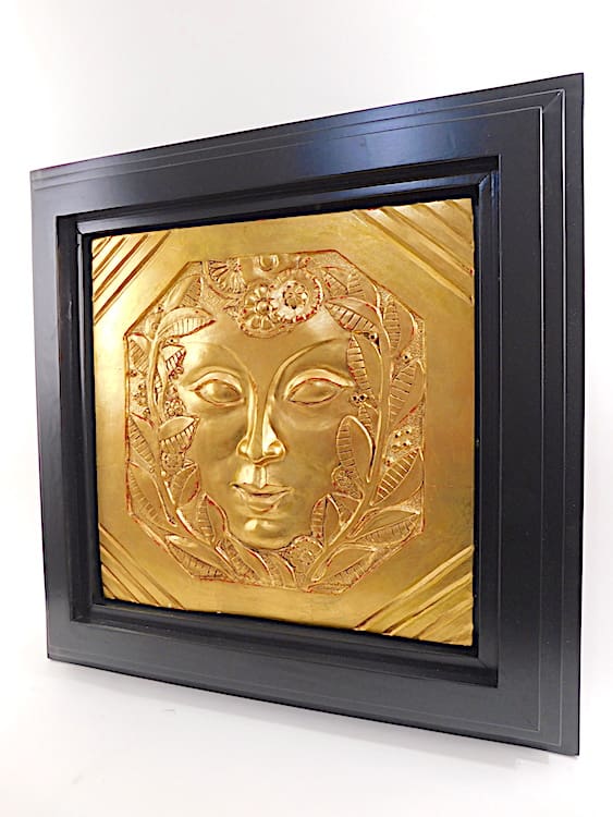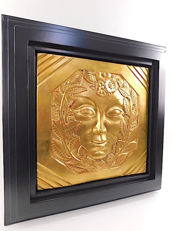 A gold leafed gesso art deco wall plaque after Marcel Bouraine. The original of this plaque was shown on the Marcel Bouraine pavilion at the 1926 Paris Arts Decoratives exhibition. Mounted in a black lacquered wooden frame.