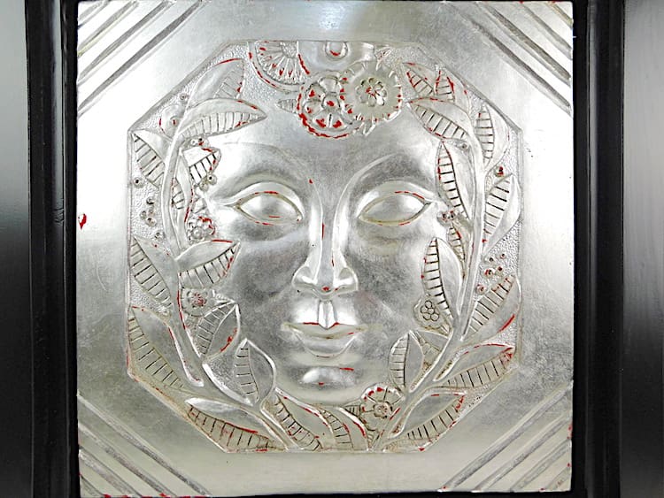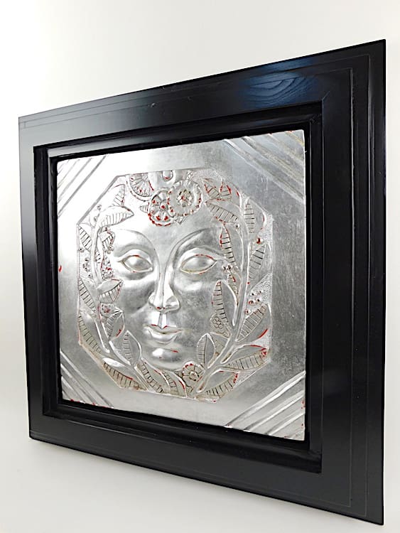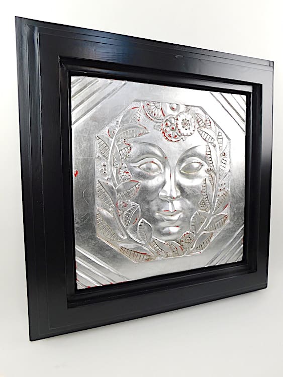 A silver leafed gesso art deco wall plaque after Marcel Bouraine. The original of this plaque was shown on the Marcel Bouraine pavilion at the 1926 Paris Arts Decoratives exhibition. Mounted in a black lacquered wooden frame.