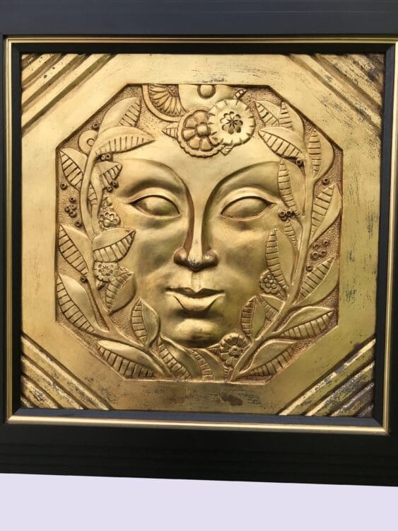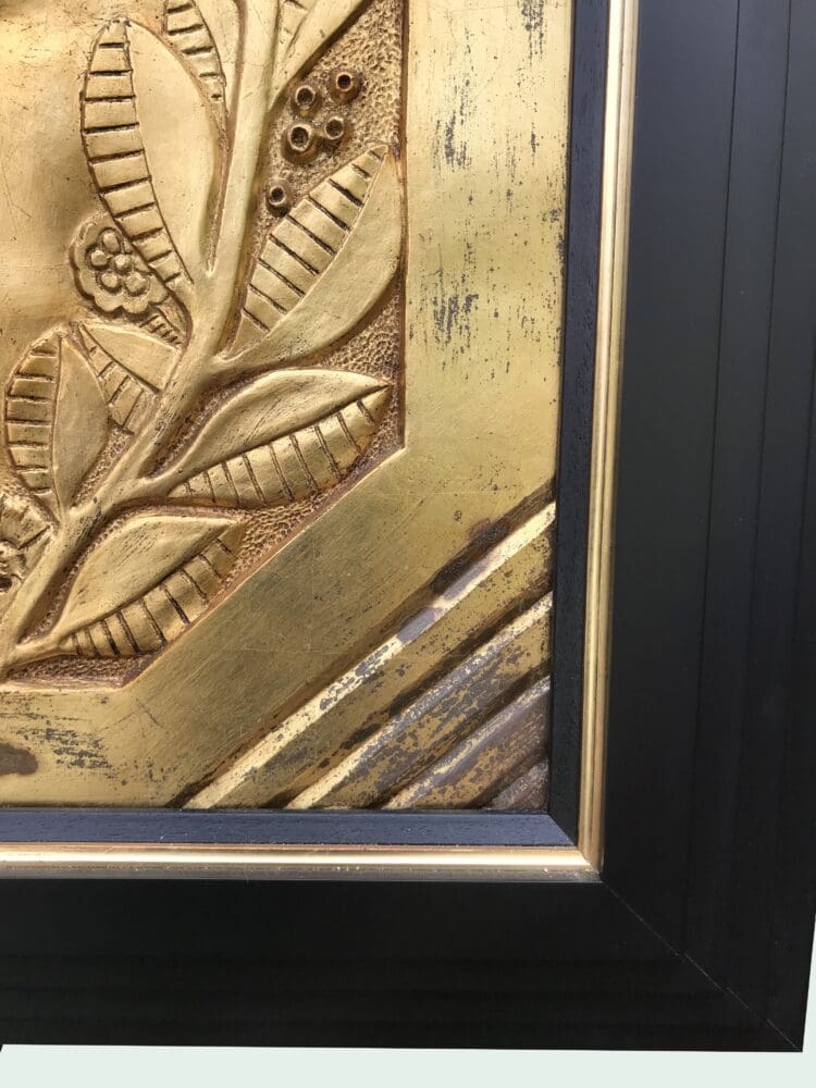 A gold leafed gesso art deco wall plaque after Marcel Bouraine. The original of this plaque was shown on the Marcel Bouraine pavilion at the 1926 Paris Arts Decoratives exhibition. Mounted in a black lacquered wooden frame.