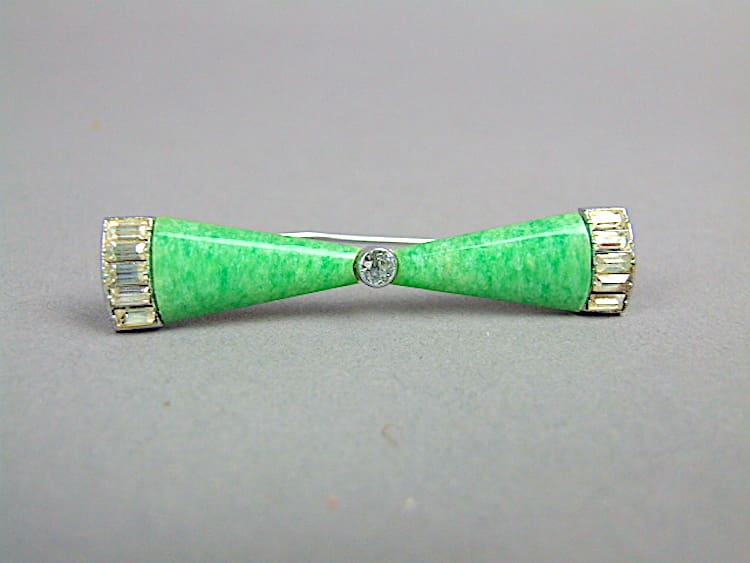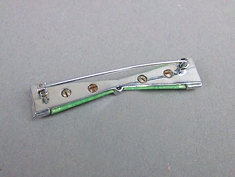 Green galalith and glass stone bow brooch. Made by Bengel in the early 1930’s and is fitted with a roll safety clasp.