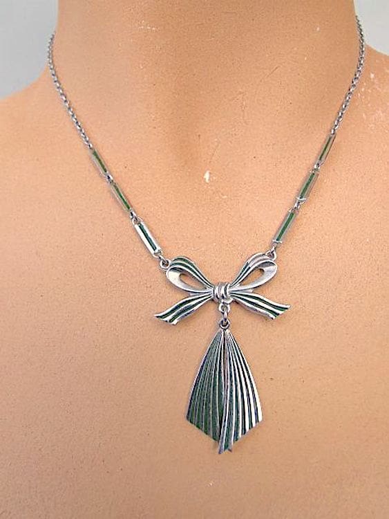 Delicate green enamel painted chrome bow necklace, made by Jakob Bengel in the early 1930’s.