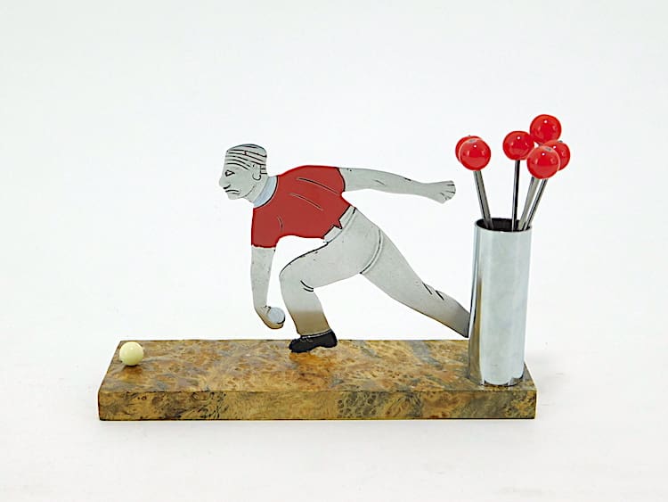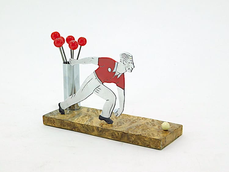 A French unsigned Sudre cocktail sticks set, made by the Cado company. Base is made of amboyne wood.