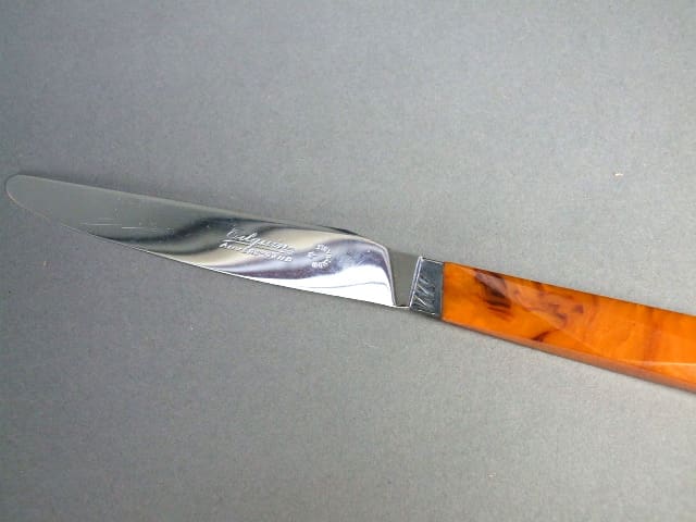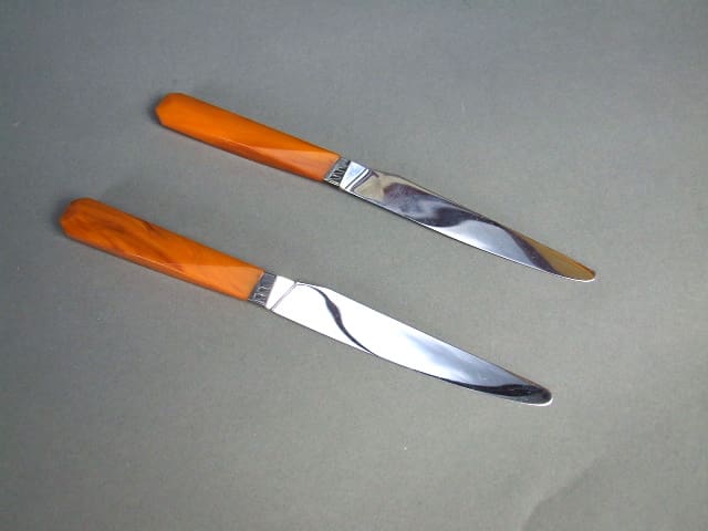 Fabulous art deco amber phenolic handled knife set. I have two of these same sets but this set has smaller knives, the other set (M2525) have larger knives but the design is the same. In their original box and stamped Cilquin to the inner lid. Signed to the knife blades Antiens Gand.
