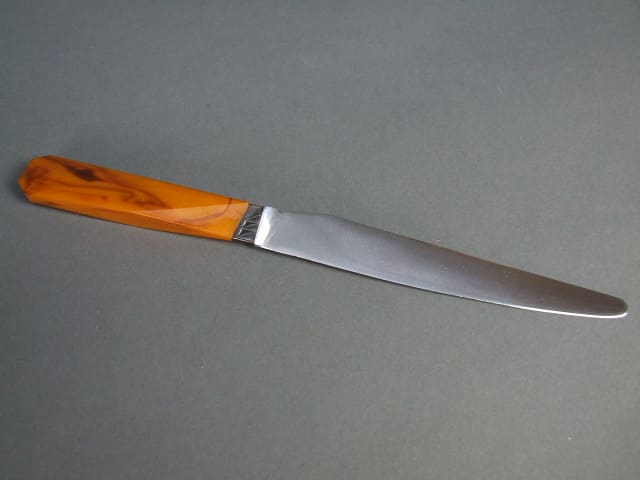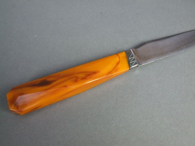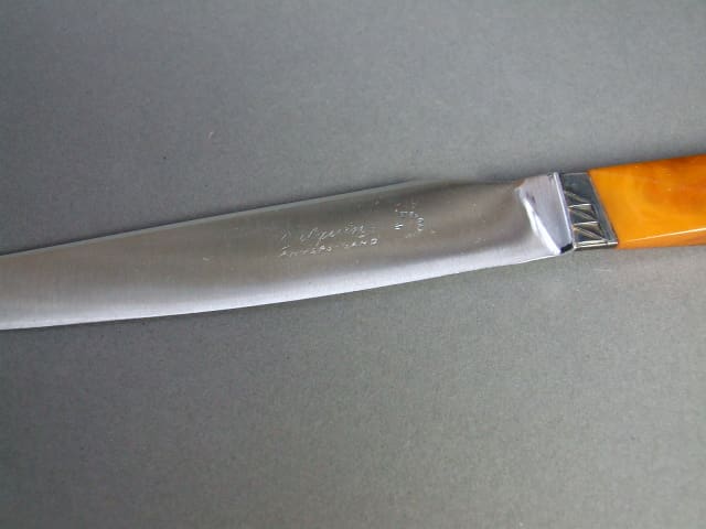 Fabulous amber phenolic handled knife set. I have two of these same sets but this set has larger knives, the other set (M2524) have smaller knives but the design is the same. In their original box and stamped Cilquin to the inner lid. Signed to the knife blades Antiens Gand.