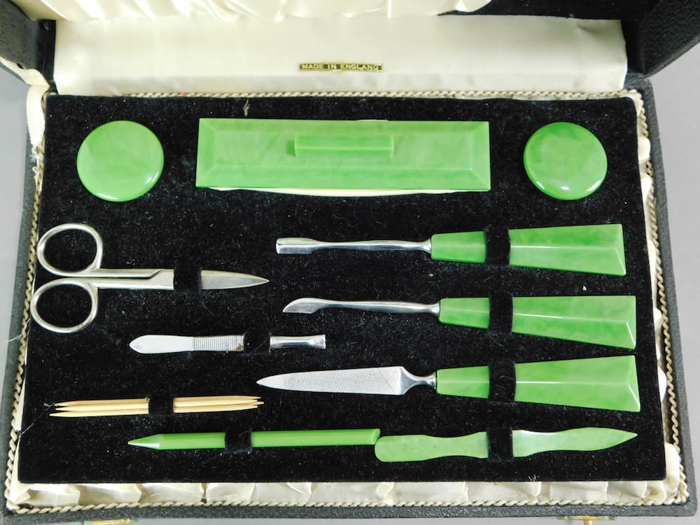 A large and comprehensive 12 piece English green celluloid manicure set in its original silk lined box