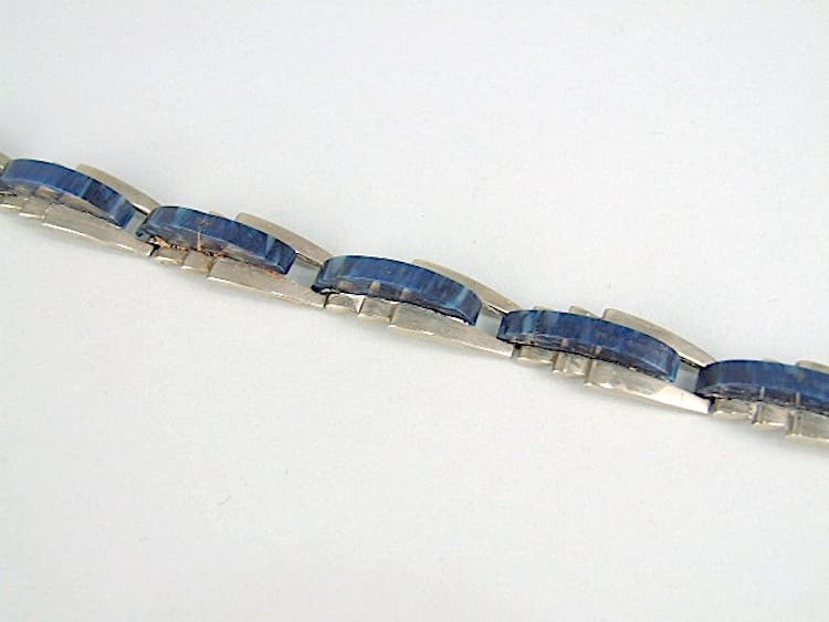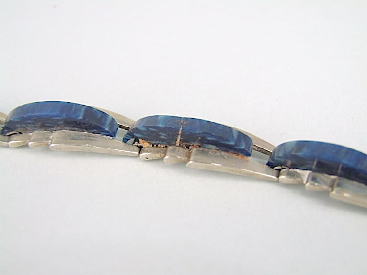 Marbled navy blue galalith bracelet by Jakob Bengel. It will fit a small to medium sized wrist.