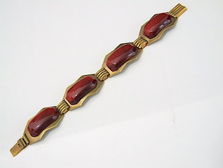 Gilt metal and ruby galalith bangle made by Bengel in the early 1930s. It will fit a small to medium sized wrist.
