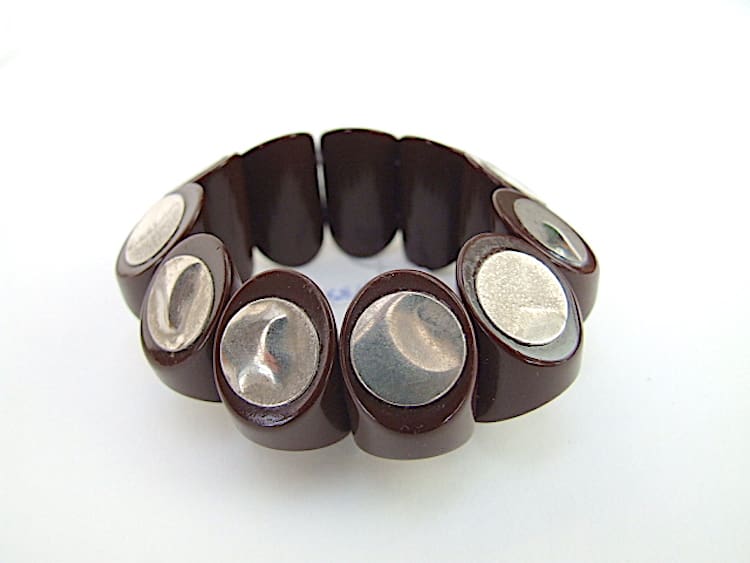 Brown galalith and chrome stretch bracelet. Made by Jakob Bengel in the early 1930’s. Is strung on a tight elastic so will only fit a small size wrist.