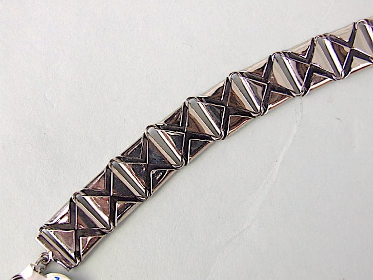 Dark green galalith sandwiched in chrome panelling. Old/new stock item that was never sold and came from the factory.