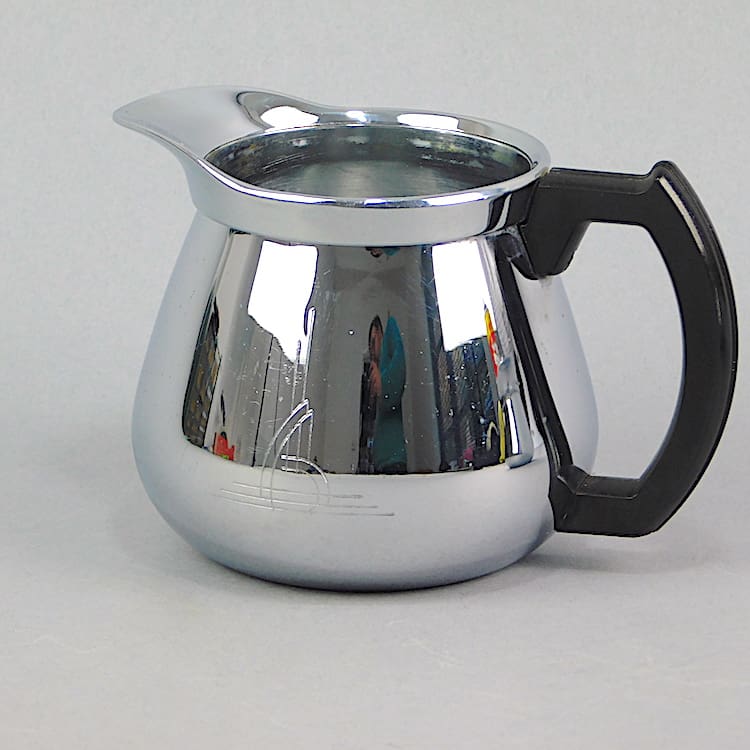 Chrome and black phenolic handled milk jug and sugar bowl with nice deco patterning to the sides. Marked Sunbeam to the base.