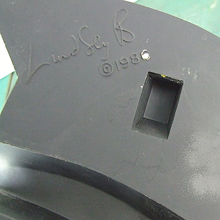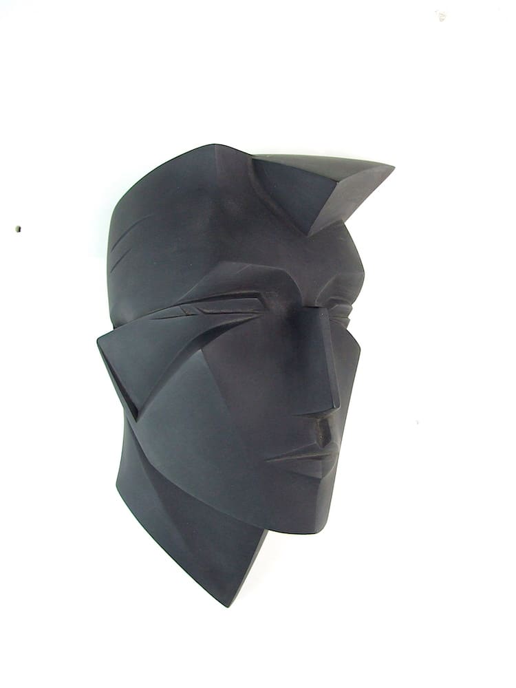 A modernist resin wall mask made in 1986 by Lindsey B (Mannequin designer). You can find out more about the artist on on info on Sculptors and Artists page. These were made for opticians shops. There is a channel to the back, ridge to the nose and high cheek bones in order to support glasses frames. Signed and dated to the reverse.