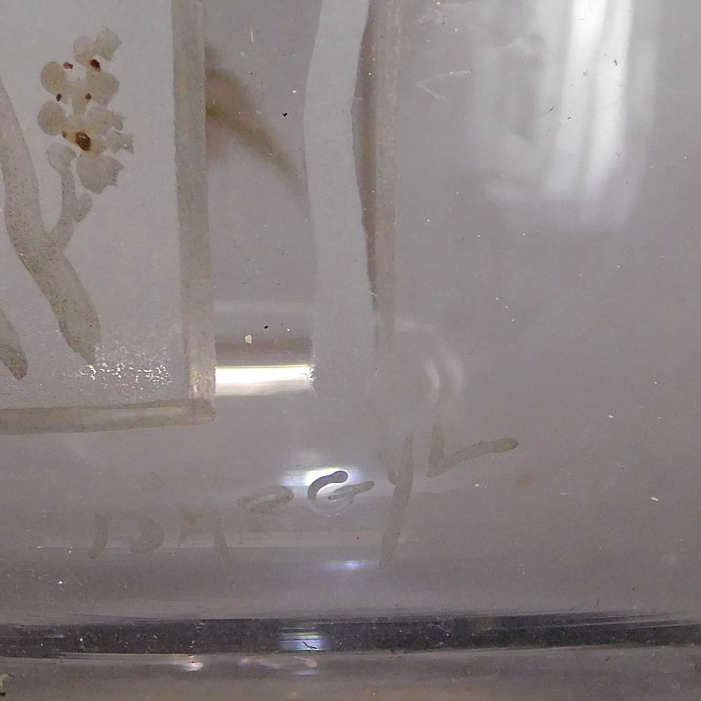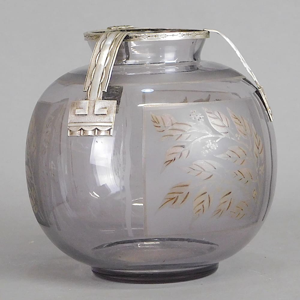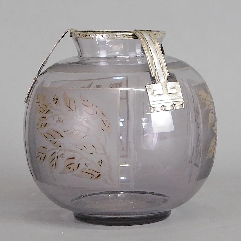 A signed glass vase with bronze mounts to the rim and 3 bronze deco motifed panels and with 3 hand decorated floral panels to the glass, signed D’argyl.