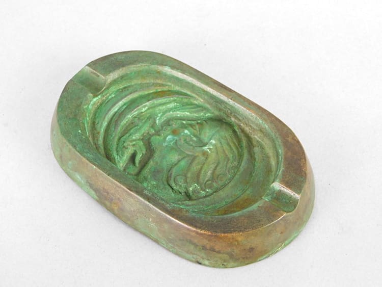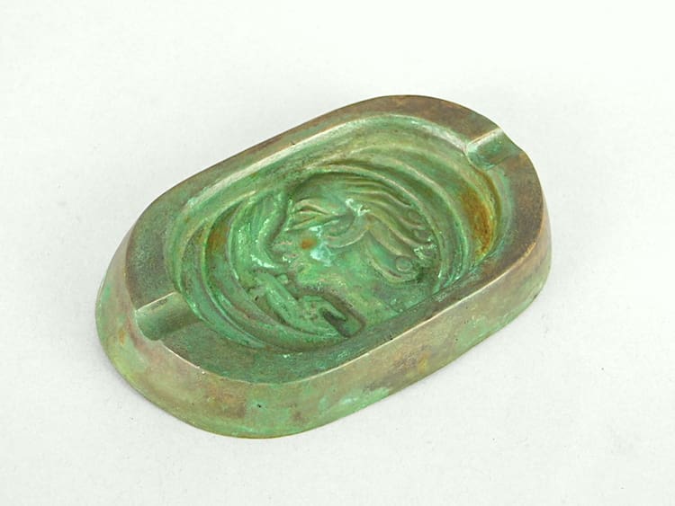French green patinated bronze art deco ashtray showing a flapper girl smoking.