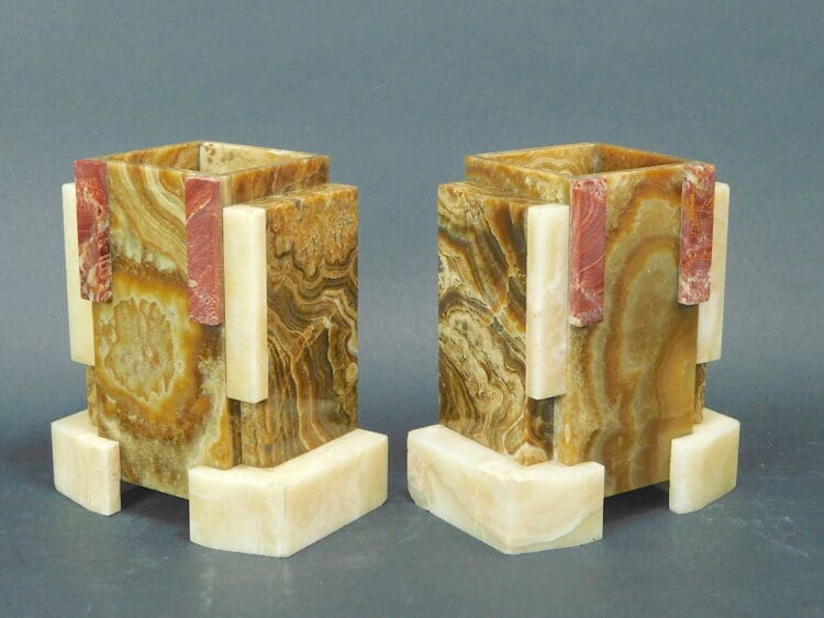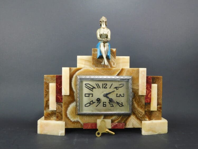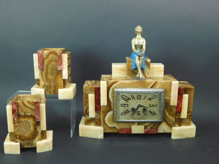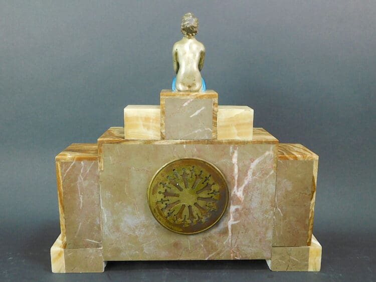 Bronze lady sitting bare breasted on top of a clock. The clock bezel is also bronzed with zig-zag detailing. The two matching side pieces complete the set.
