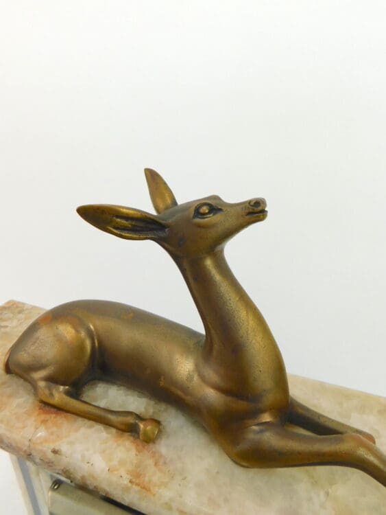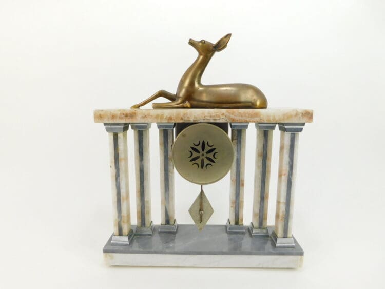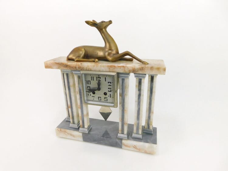French 4 glass clock set has a bronze deer on the top comes with 2 matching side pieces with chrome motifs to the front.