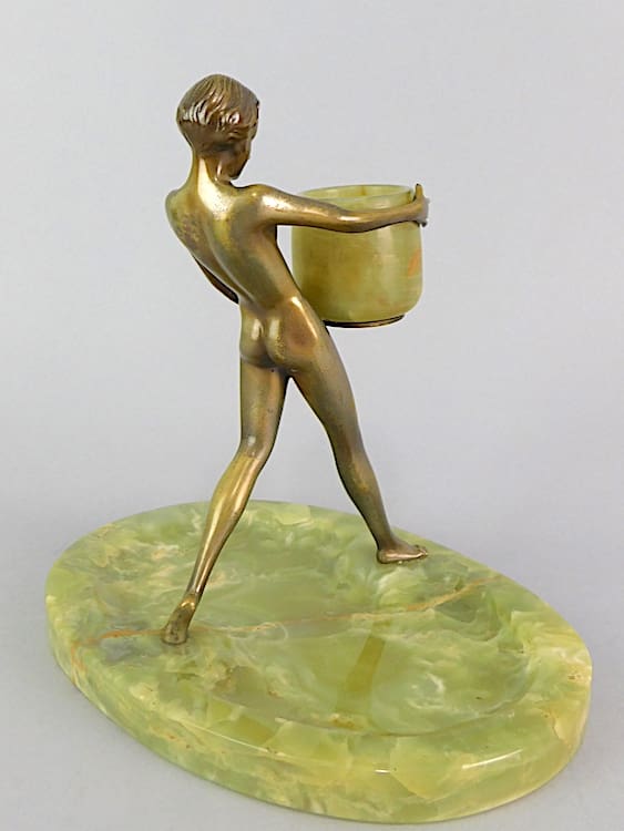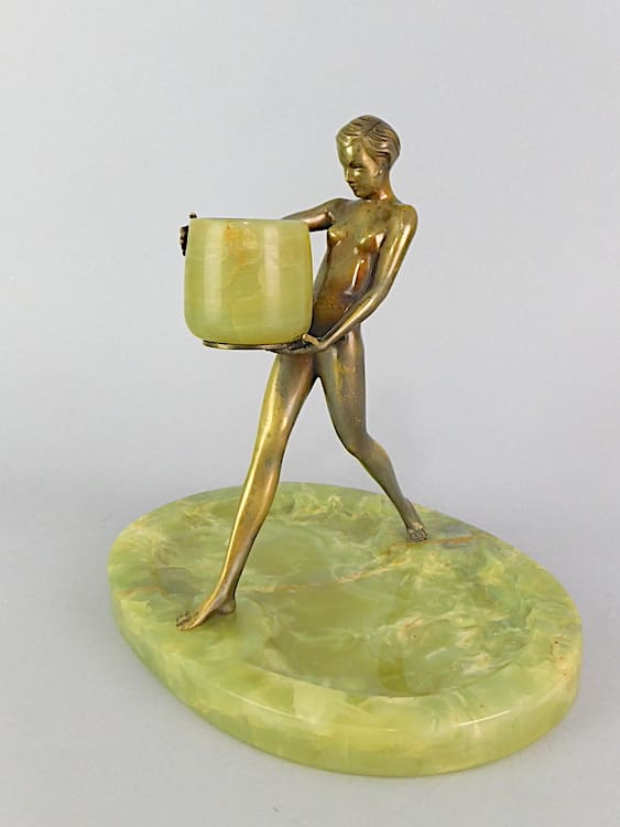 A lovely nude bronze mounted on a double-dished base of green onyx and holding an onyx cup. The lady retains some silvering and is apparently unsigned, but undoubtedly by Lorenzl. We have 2 for sale, the other one is shown left in the double picture.