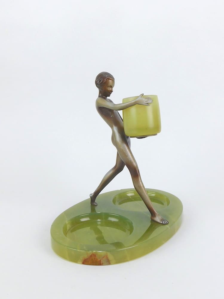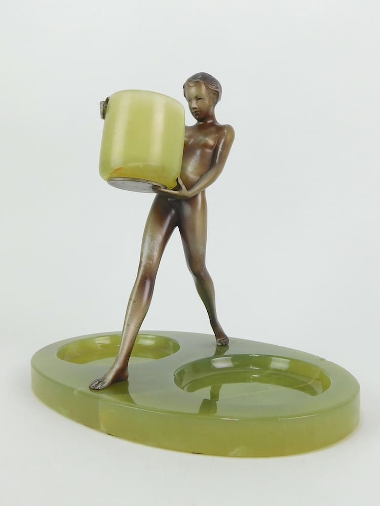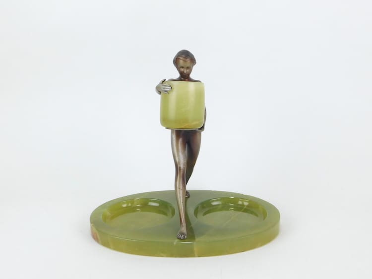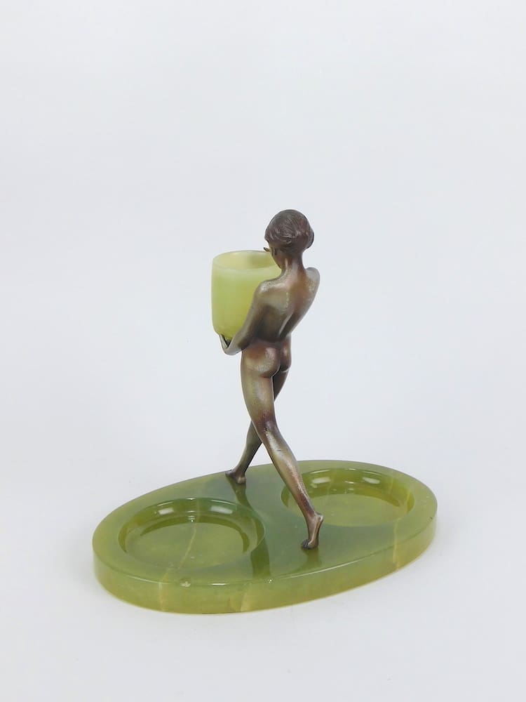 A lovely nude bronze mounted on a double-dished base of green onyx and holding an onyx cup. The lady retains some silvering and is apparently unsigned, but undoubtedly by Lorenzl.