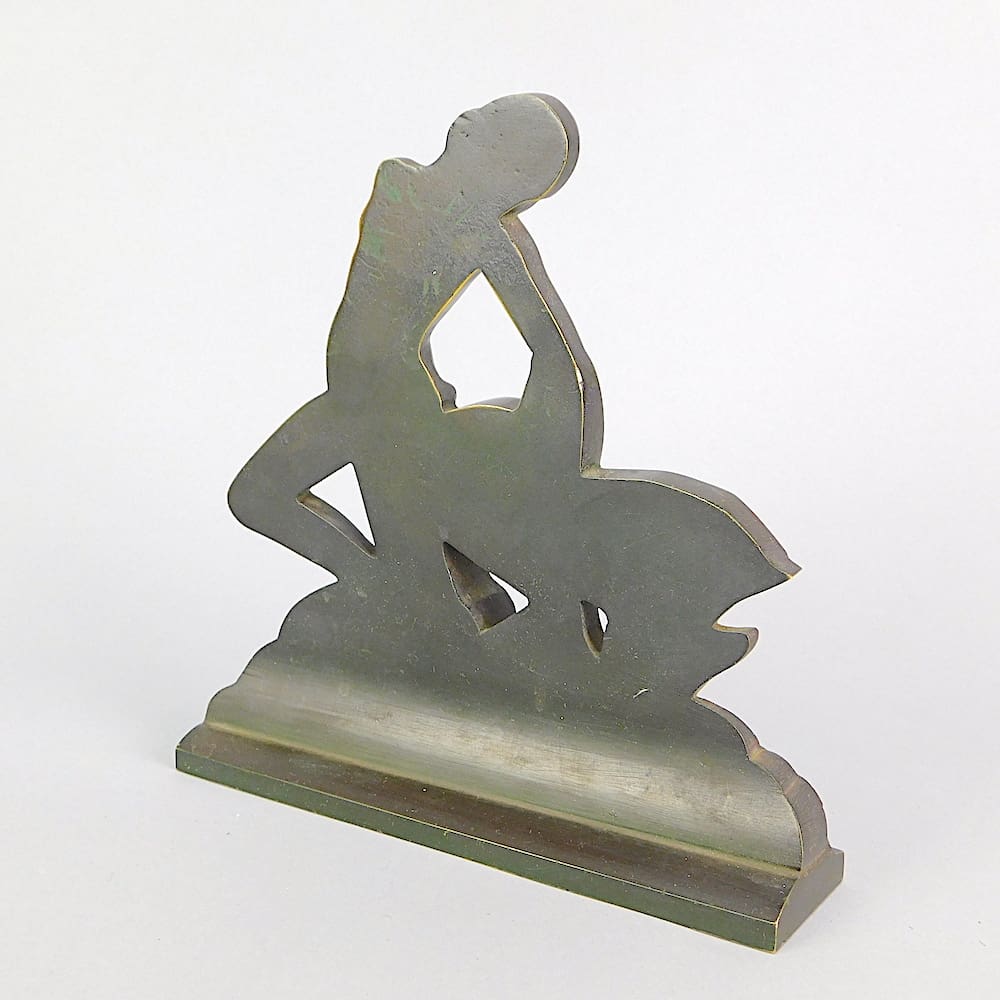 Green patinated bronze girl and deer. Unsigned and sculptor unknown.