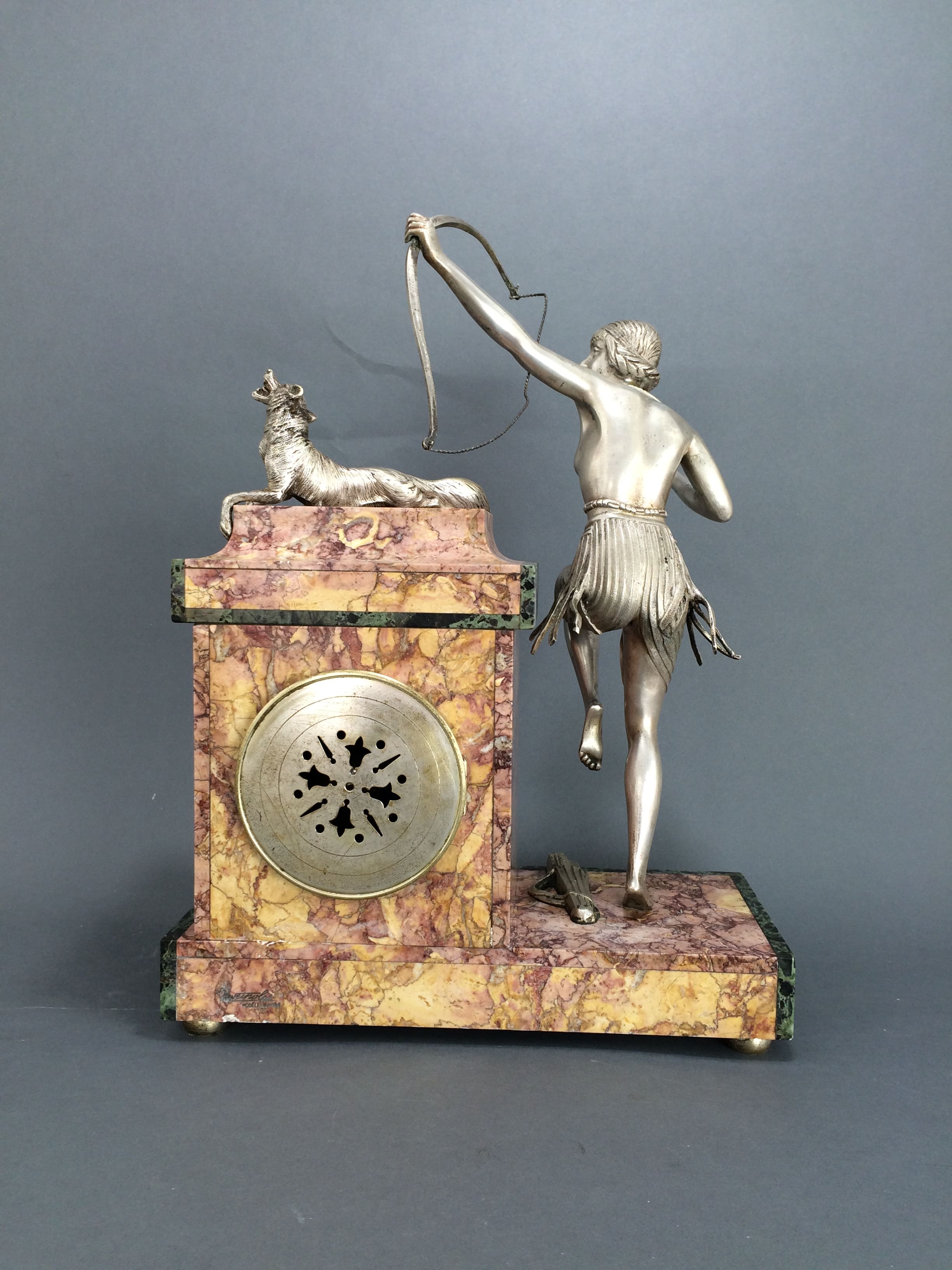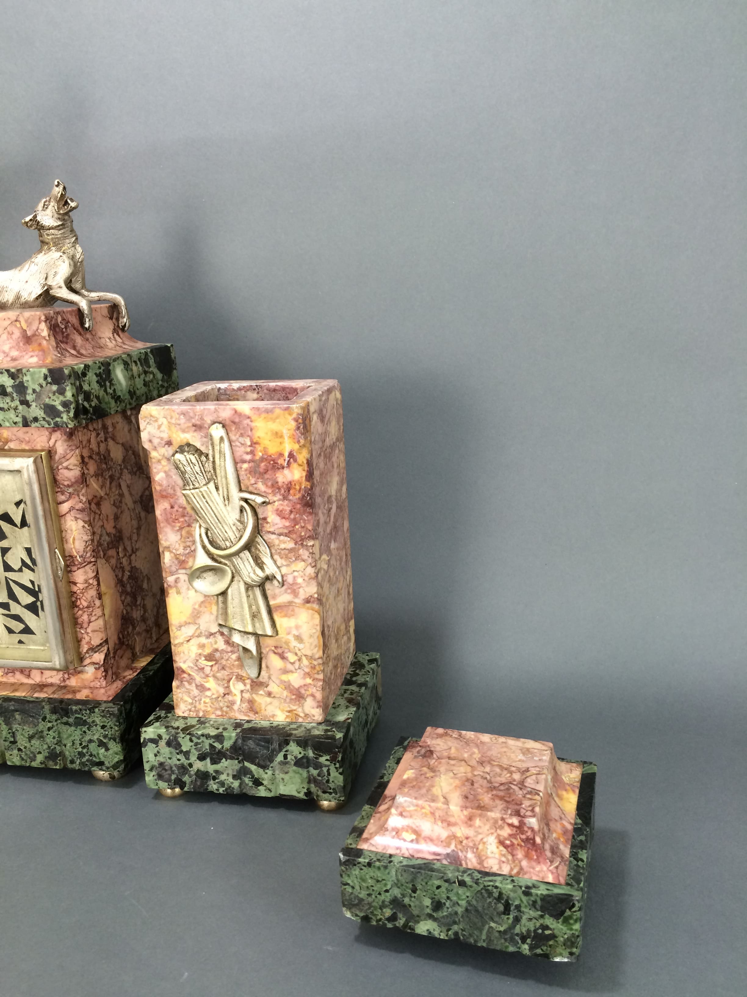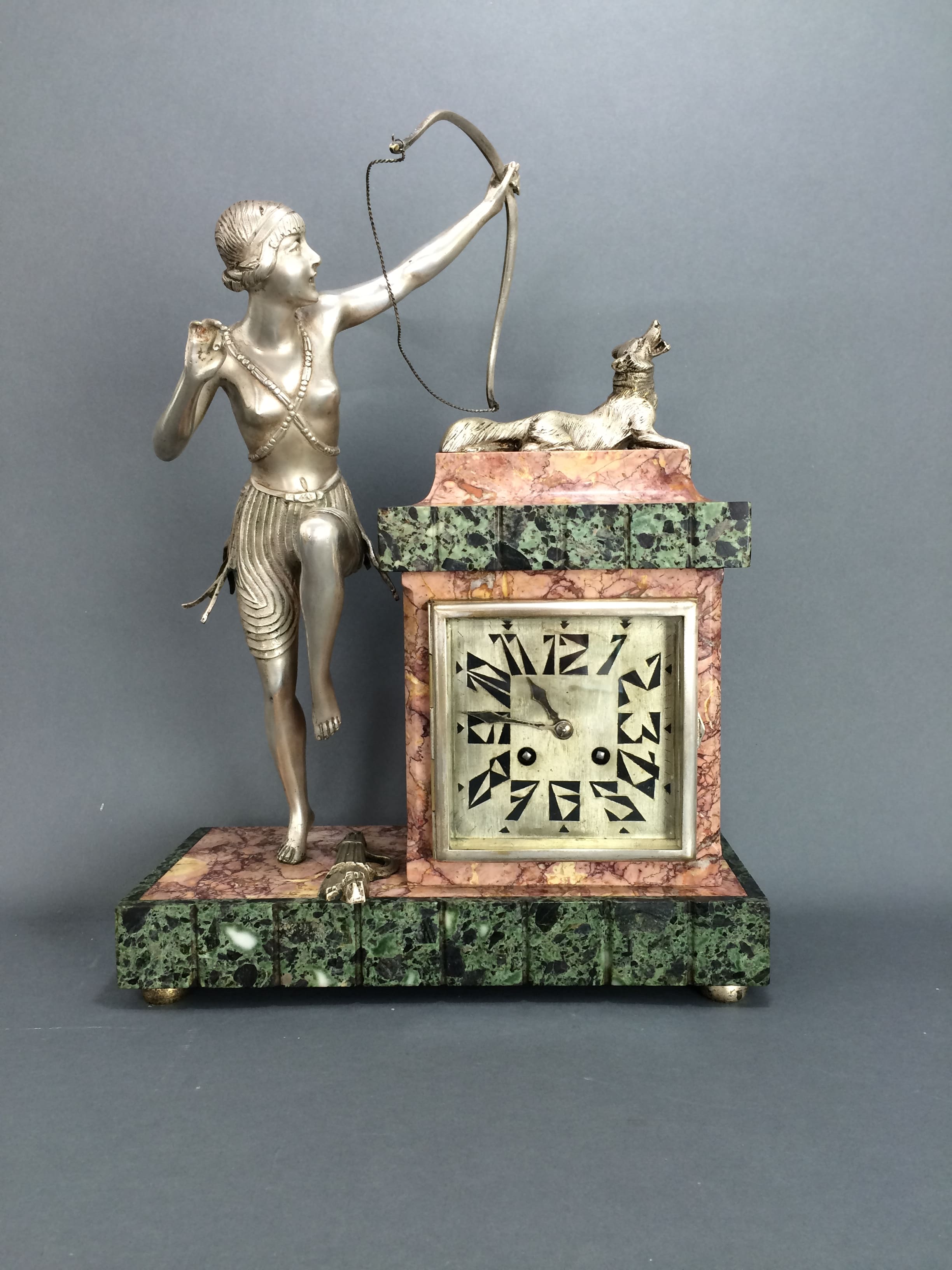 French silvered bronze clock set by the Belgian artist Claire Jean Roberte Colinet. This one unsigned but I have seen the same bronze lady as a statue and the base was signed in the bronze socle Colinet. To the side is a silvered bronze Diana with a fox. The clock face with typical art deco numerals. On the front of each garniture is a silvered bronze plaque of arrows and a hunting horn. The tops of the side vases lift off. This is very rare as a clock as it was usually made as a statue.
