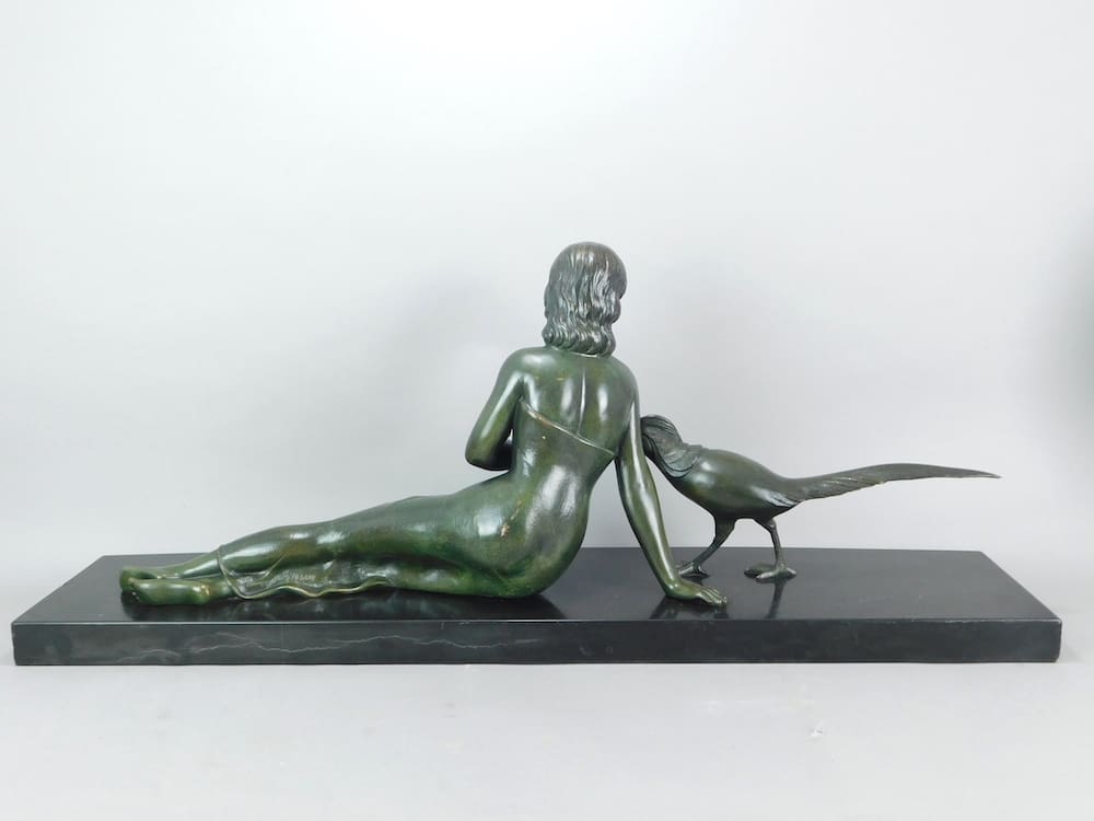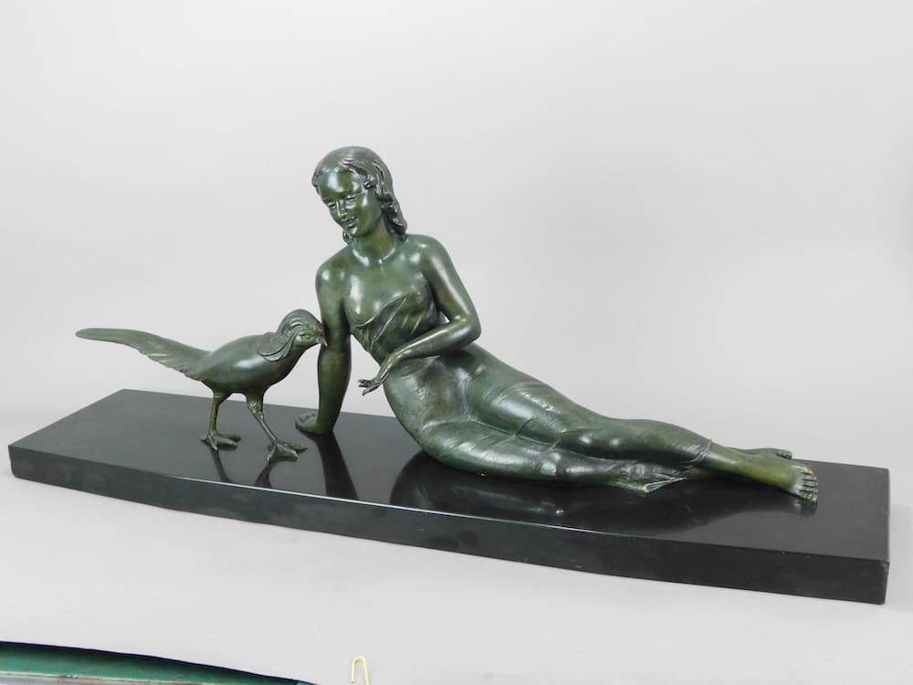 A large bronze lady and peacock on a bow fronted black marble base. The figures are green patinated bronze and are signed and stamped bronze in the metal.