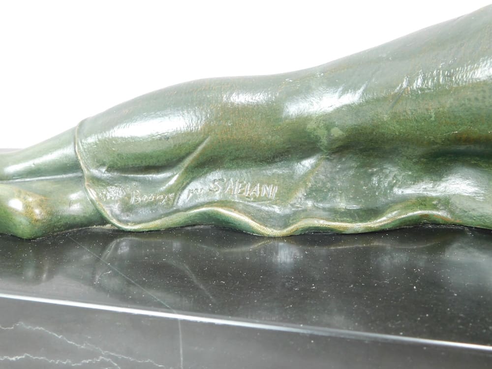 Condition is very good, with just a hint of the bronze wearing through the patina and some minor nibbles to all 4 corners of the heavy base and a single larger chip to the right hand edge of the marble.