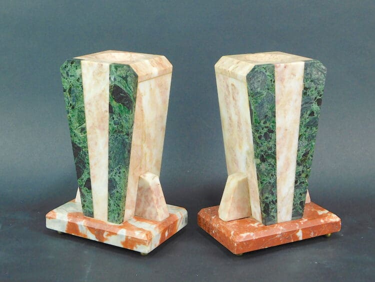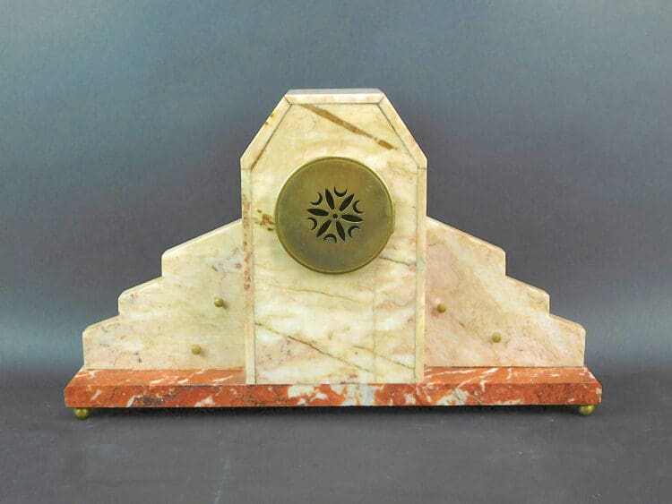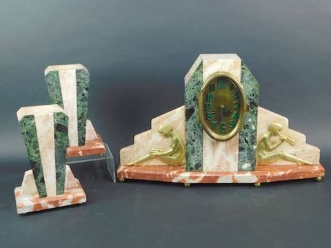 French art deco clock set with 2 bronze silhouette ladies flanked on either side of the clock face. The clock is made of Rosso and verdegre marble with cream onyx detail.