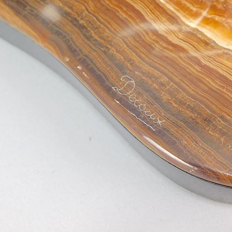 Mounted on a curved black Belgian and brown onyx marble base which bares the Decoux signature.