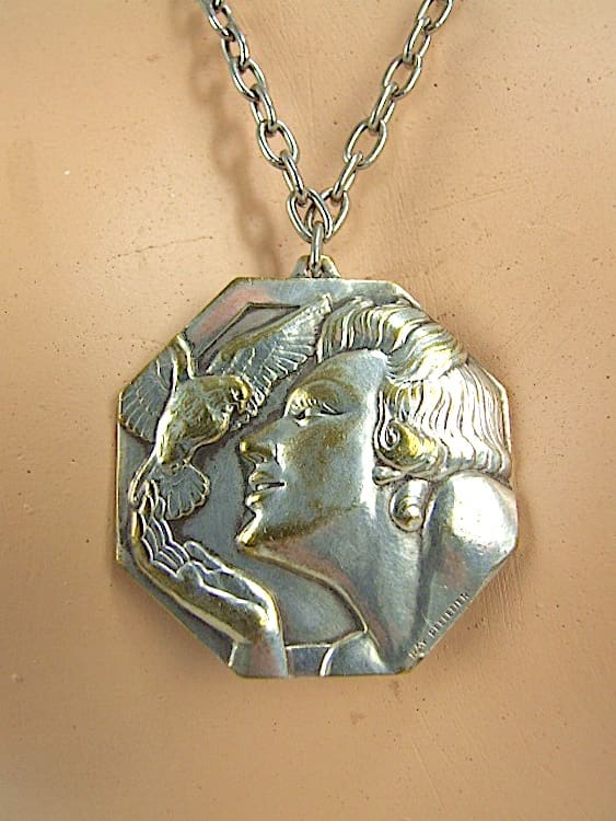 French silvered bronze octagonal medal pendant necklace. Signed Raymond Pelletier, a lovely lady and dove. This same lady was made as a medal, a brooch and a pendant. Fitted with a screw clasp.