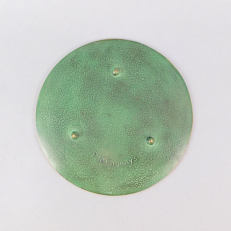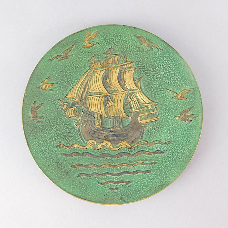 A rare green bronze ship dish by Pierre Le Faguays, signed to the reverse. Produced by the Le Verrier foundry.