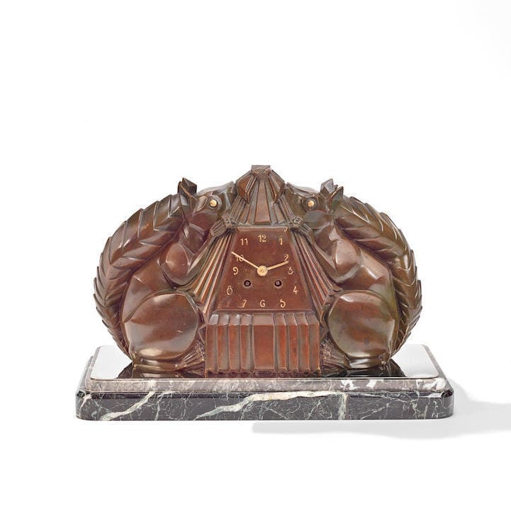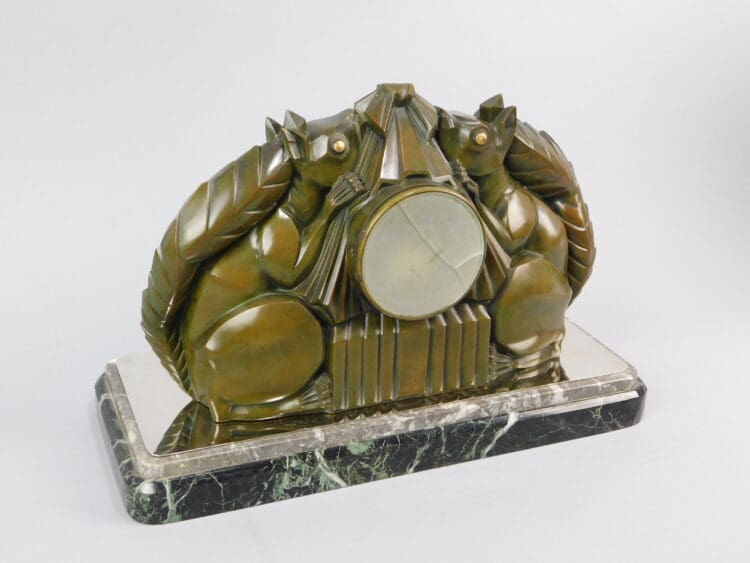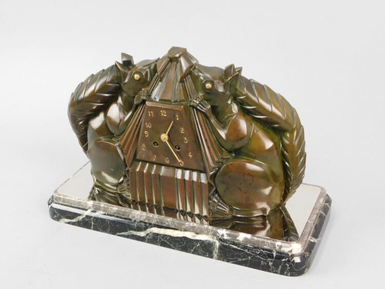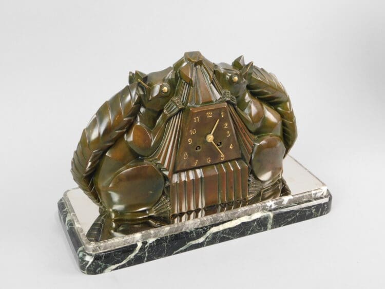 Stylised French bronze clock is a mix of stylisation and cubism. The quality is exceptional. The bronze patinated squirrels sit on a chromed bronze plate on a grey and verdigris marble base. The quality movement is stamped ‘Medallie D’Argent 1855’.