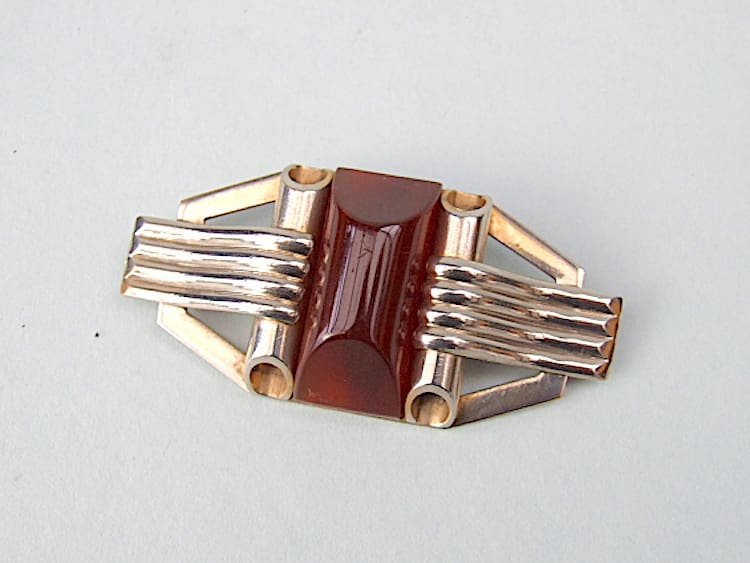 Large gold tone metal and amber phenolic brooch.