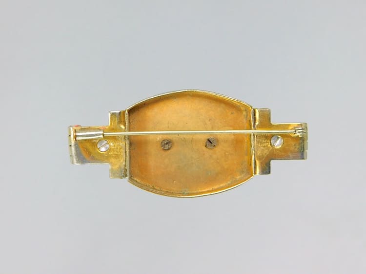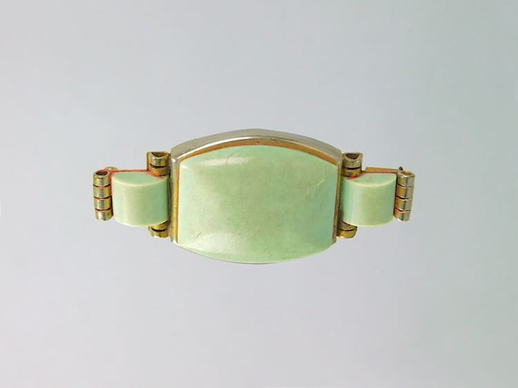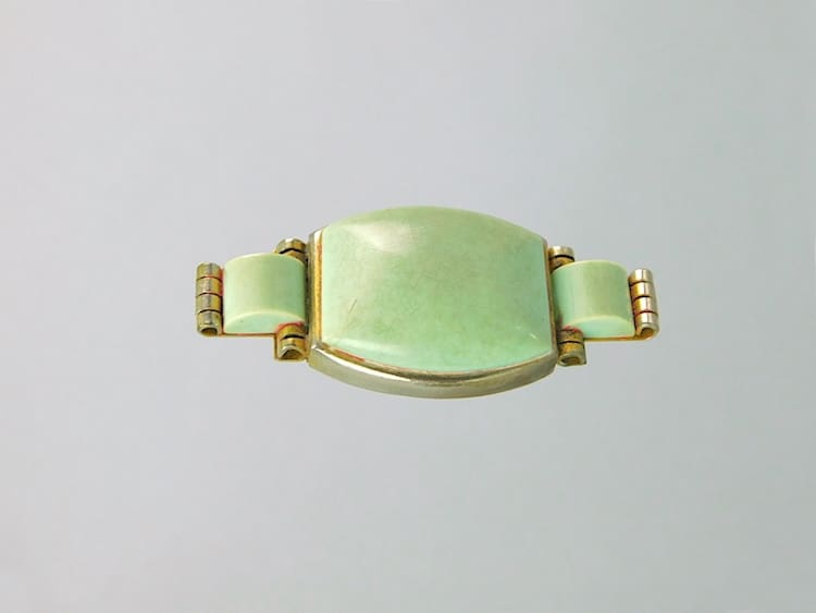 This aqua green galalith and gilt metal brooch was made in the early 1930s for the Fabon company in Paris. It is signed Fabon to the back and is fitted with a slide safety clasp.
