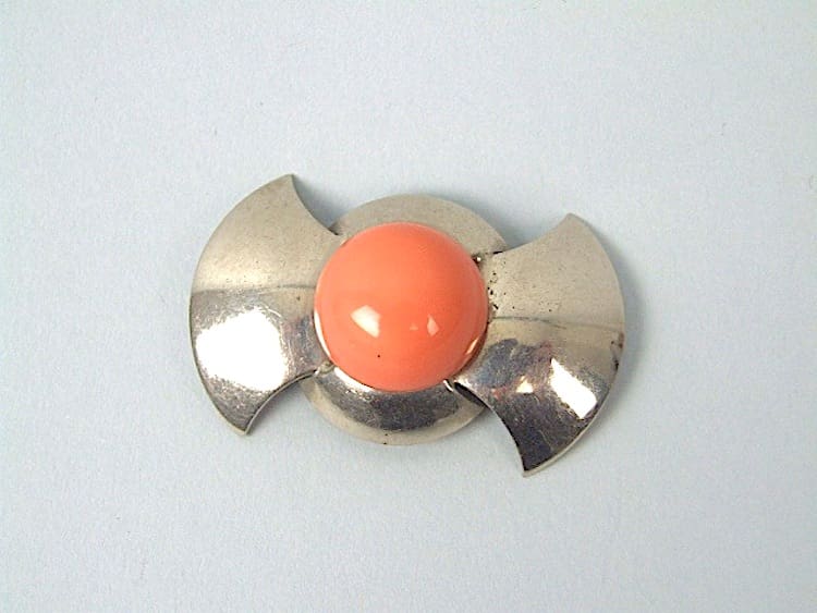 Chrome and pink galalith brooch. Made by Jakob Bengel.
