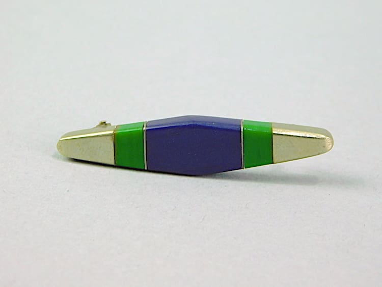 Early 1930’s Jakob Bengel bar brooch, made of green and navy galalith and chrome.