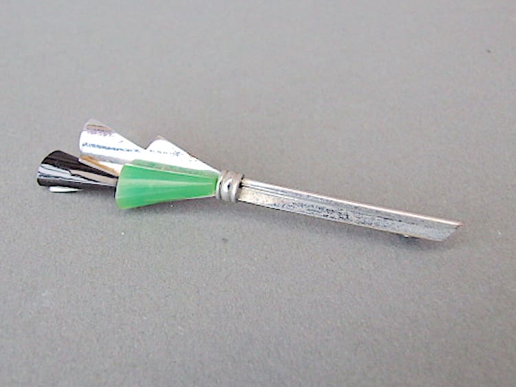Green and black galalith and chrome bar brooch.