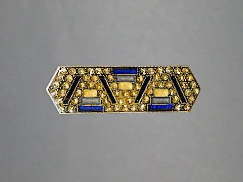 Blue and cream enamel brooch by Pierre Bex of Paris. It is fitted with a safety clasp.
