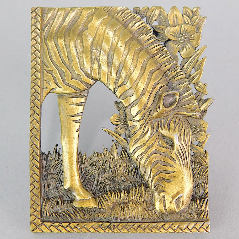 Zebra brooch by JJ. Vintage USA brooch, signed to the reverse. Fitted with roll safety clasp.