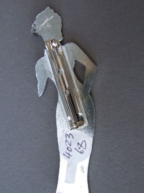 This chrome female singer brooch is from a vintage range called the Ferraggioli range, which was made by Pierre Bex in the early 1960’s. Fitted with a roll safety clasp and signed Ferraggioli to the reverse.