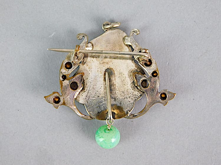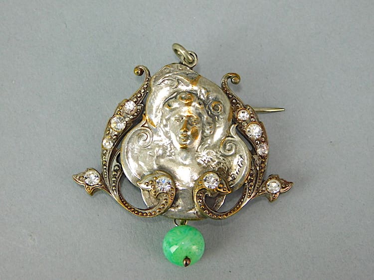 Very pretty original brooch/pendant with the image of a maiden surrounded by scrolling with paste stone detailing.