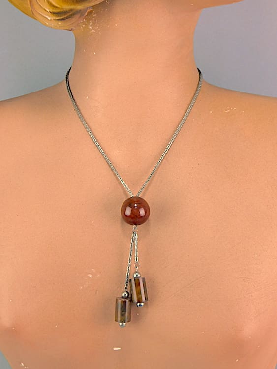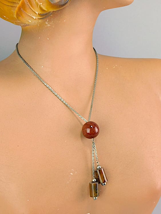 Brown tortoiseshell galalith tubes on intricate link and central ball. Made by Jakob Bengel during the early 1930’s.