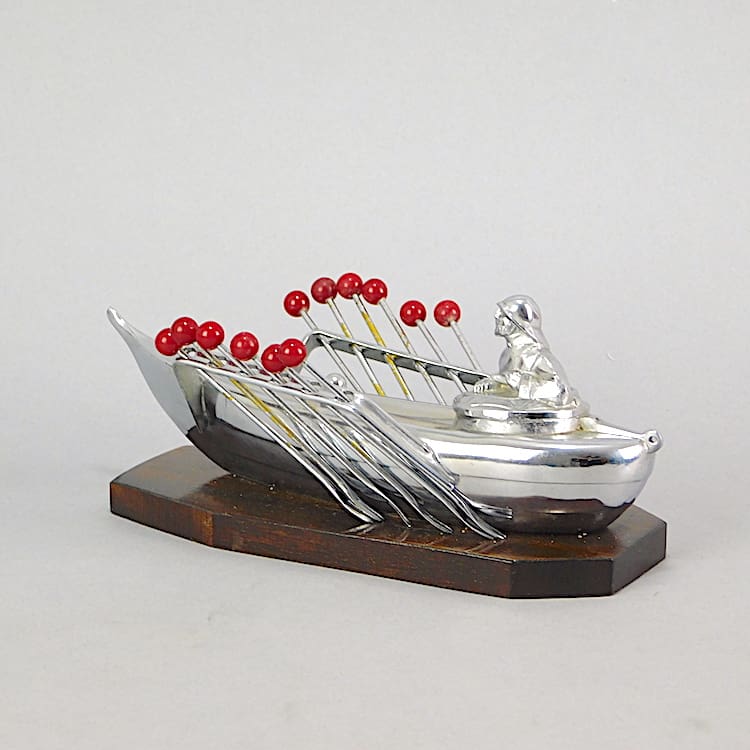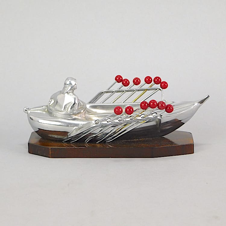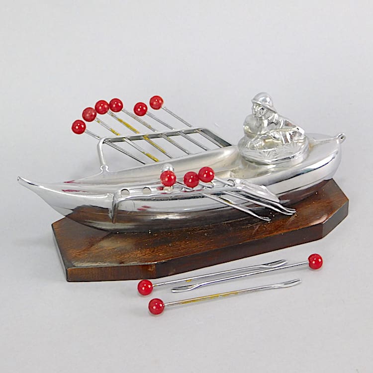 Chromed metal man in a boat with 12 phenolic handles cocktail sticks as oars. Unsigned but attributed to Benjamin Rabier. Mounted on a wooden base.