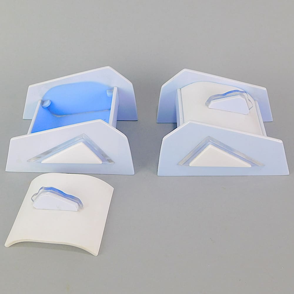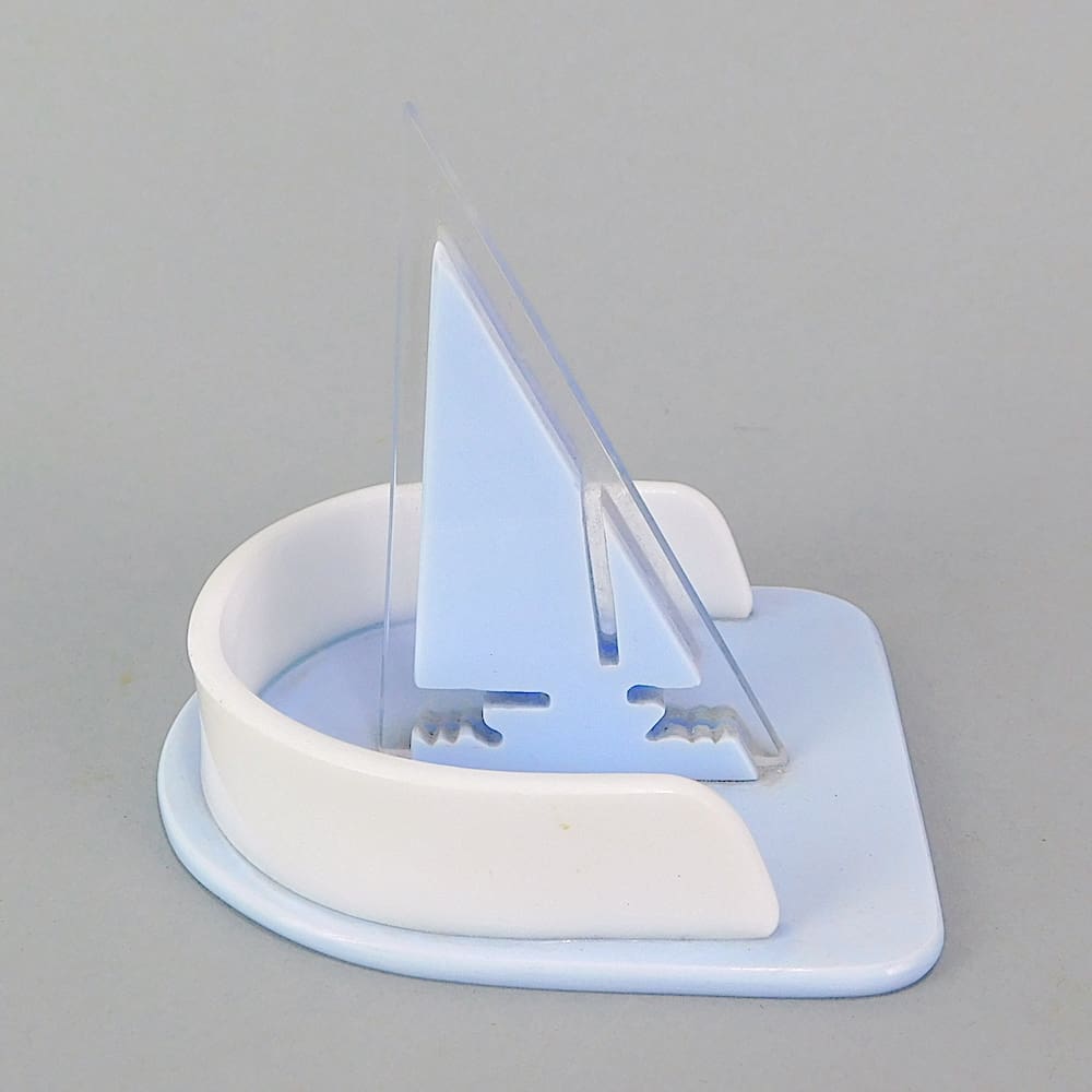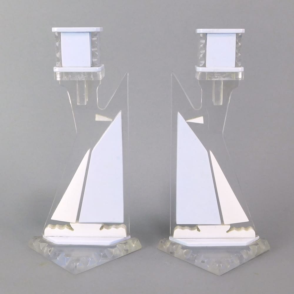 An English phenolic blue and white 6 piece set consisting of a pair of candlestick holders, a trinket dish, a pair of smaller boxes and a larger jewellery box in a nautical theme. Depicts yachts and icebergs.
