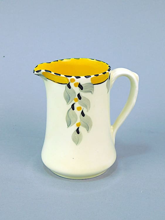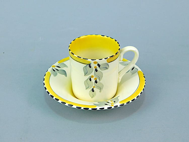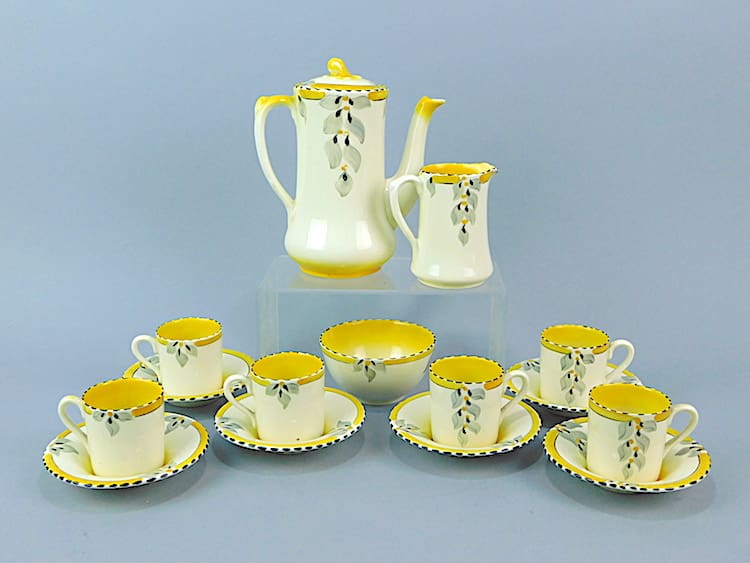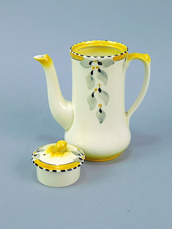 Pretty yellow and grey coffee set consisting of pot, jug, bowl and 6 cups and saucers.