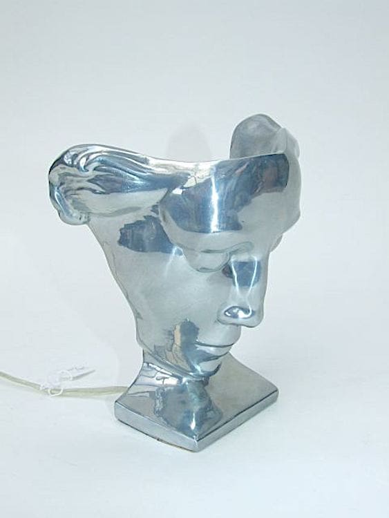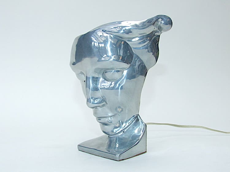 Aluminium windswept lady bust with a bulb holder to the back. A reproduction Frankart style lamp, made by Sarsparilla. It is signed Sarsparilla and Frankart to the back panel.
