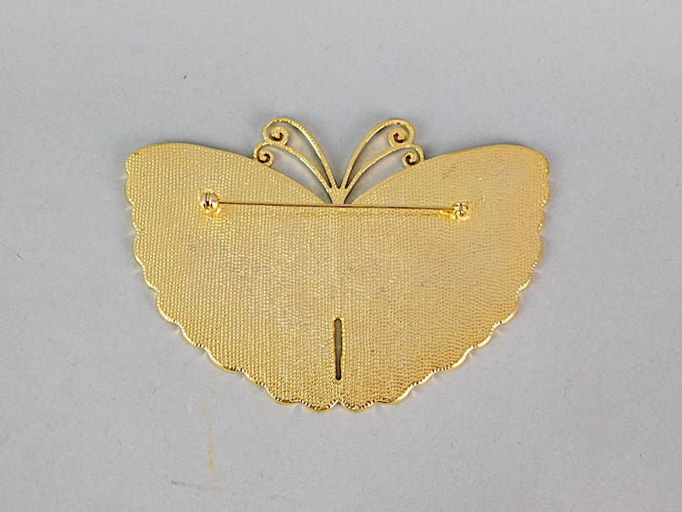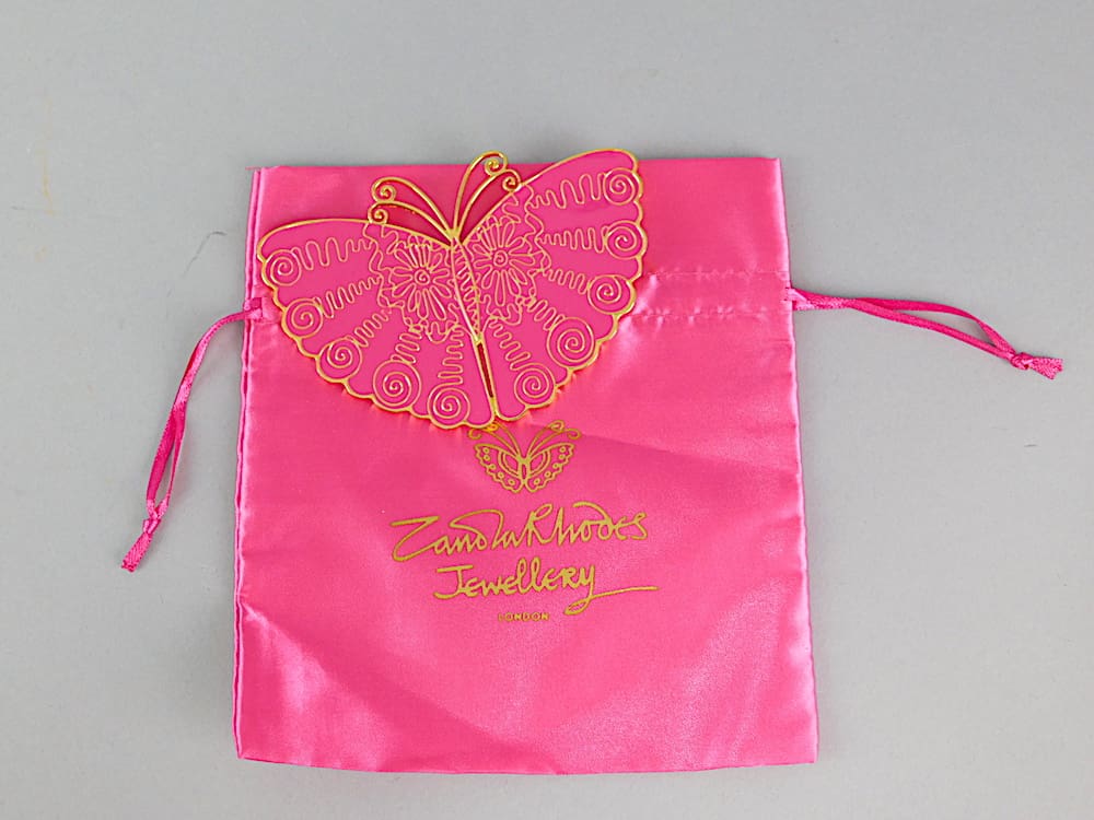 A very large pink and gilt butterfly brooch by Zandra Rhodes with its original satin pouch. Fitted with a roll safety clasp.
