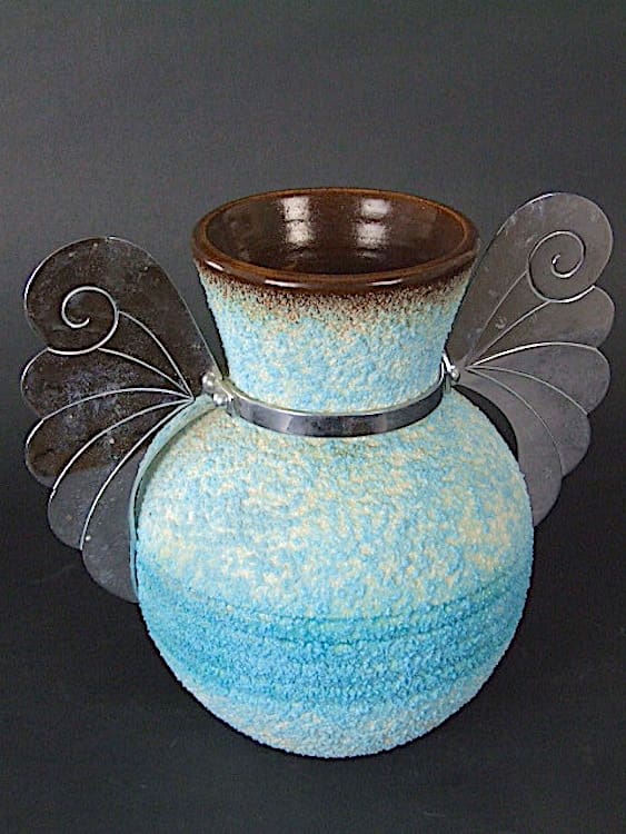 Unusual French sponge glazed terracotta vase by Louis Dage and the chromed metal wing handles by Andre Villien and signed indistinctly to the base.