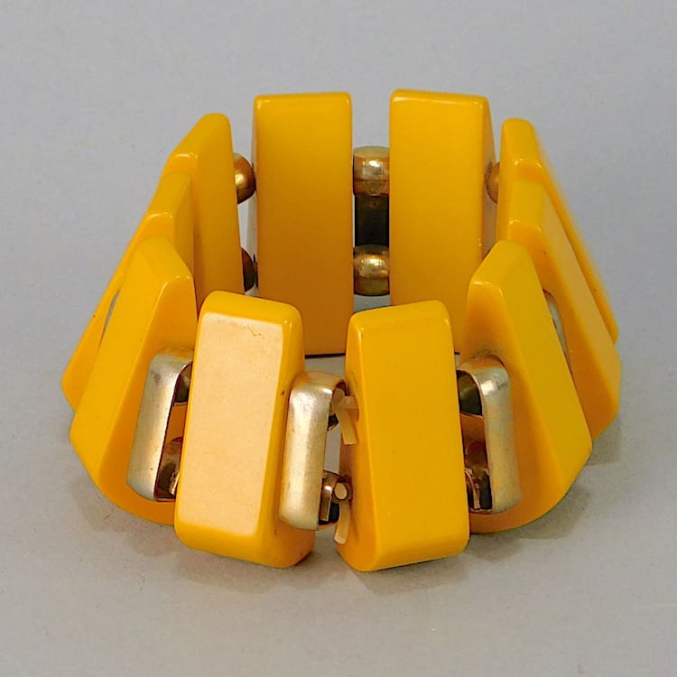Chunky American art deco stretch bangle, made of butterscotch phenolic and gilt metal panels.