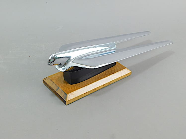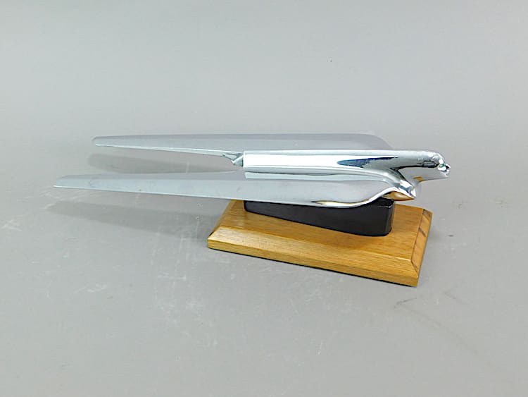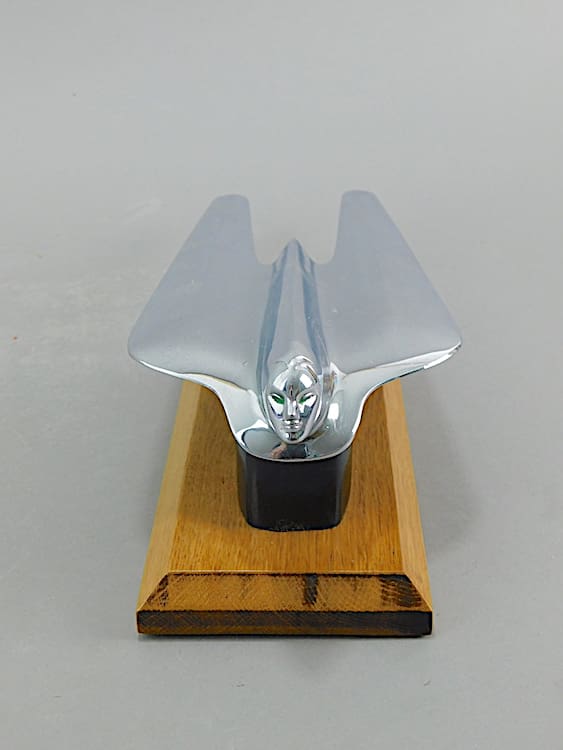American art deco chromed metal car mascot from a 1950 Cadillac motor car. A chromed metal flying Goddess, now mounted on an ebonised wood base.